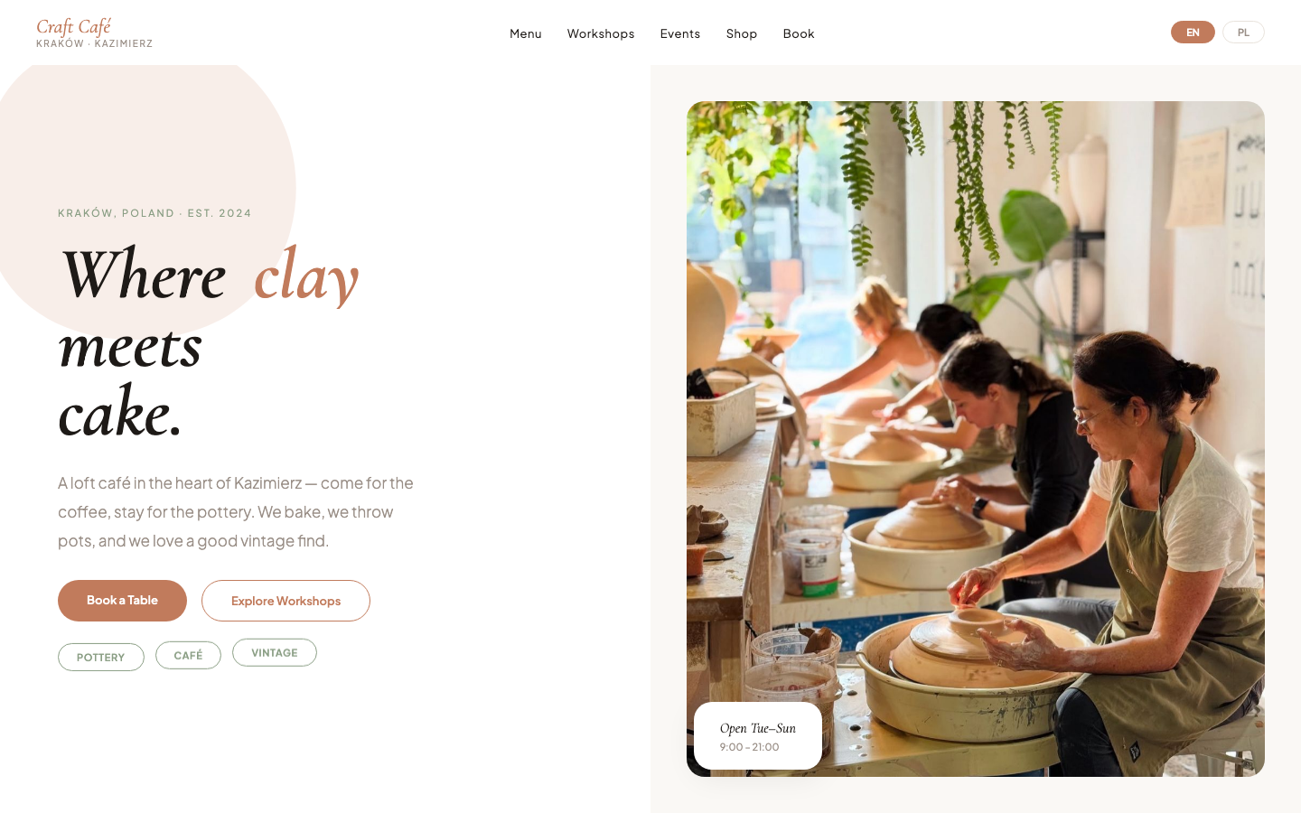 Atmospheric website for a café in Kazimierz district. Online table reservations, sign-ups for ceramics workshops and an events calendar. Aesthetic fully aligned with the venue's character.